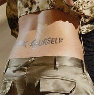 Alicia Keys doesn't have any real tattoos which we know about, however she has been spotted with a couple of fake tattoos on her lower back, including the phrase "THINK 4 URSELF" and a heart design.